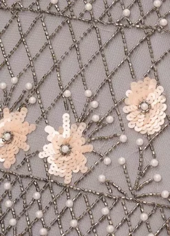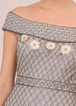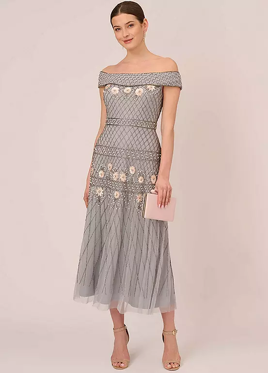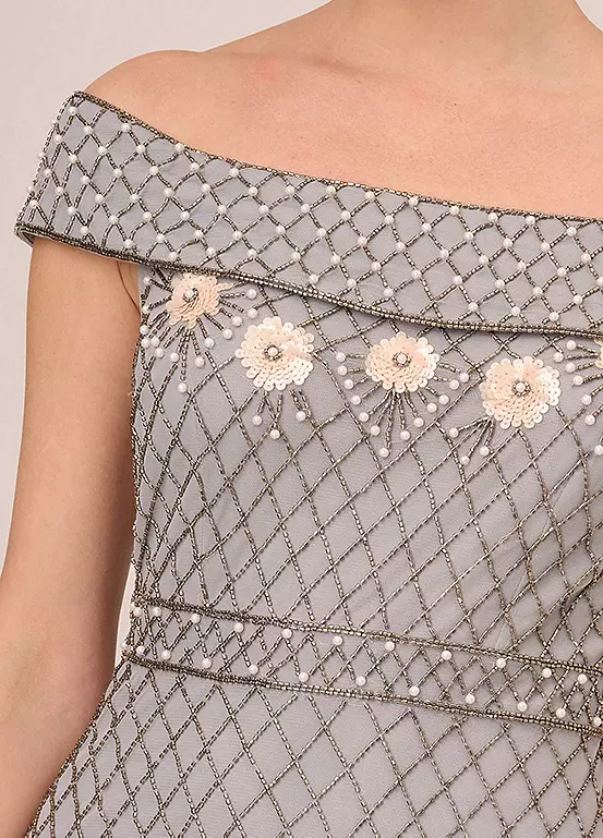 Off the Shoulder Ankle-Length Dress with Beaded Floral Accents, It’s the simplest details that make this beaded dress into a classic you’ll love to wear for years to come. This ankle-length dress features an off the shoulder neckline, fitted bodice, and soft skirt. Fully lined, this dress has a sweet mesh overlay embellished with a gorgeous mix of contrasting beaded patterns and accented by pearl beads and sequin flowers. A zipper back closure completes the design. Styled with a neutral or metallic heel, this off-the-shoulder formal dress is a stunning look.