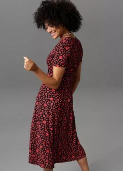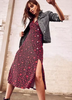 Floral dress in a wrap look with decorative buttons, v-neck, short sleeves and a slit in the hem. In a midi length and made from soft flowing, sustainable material.