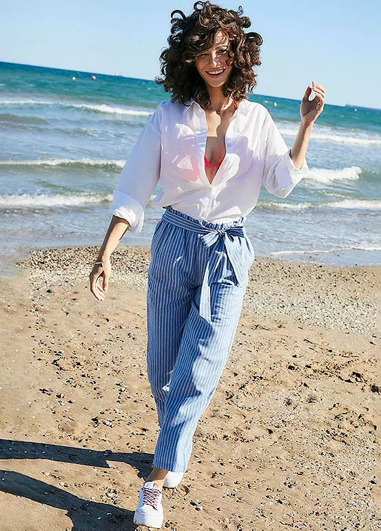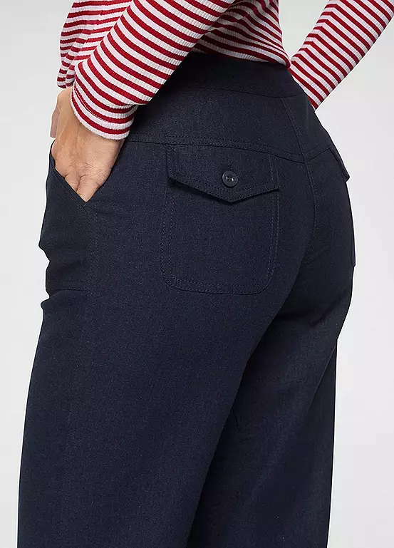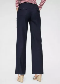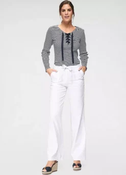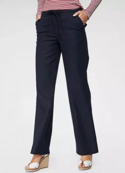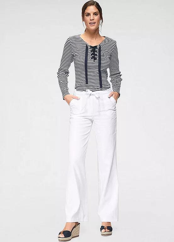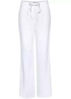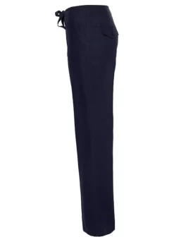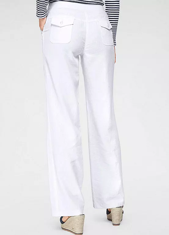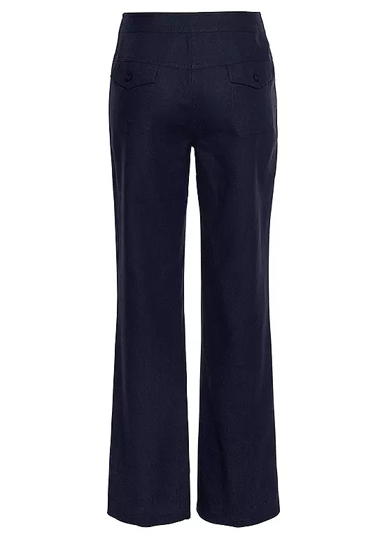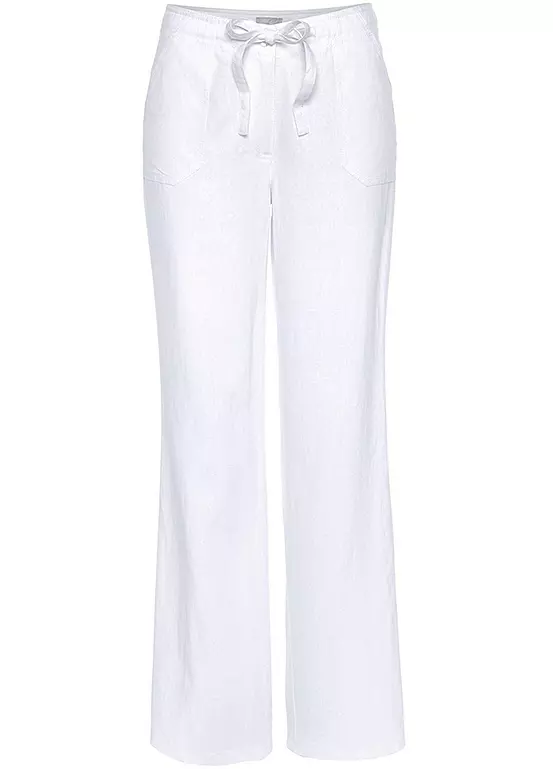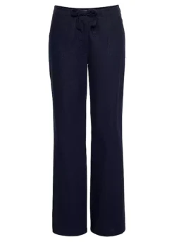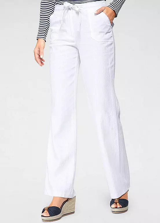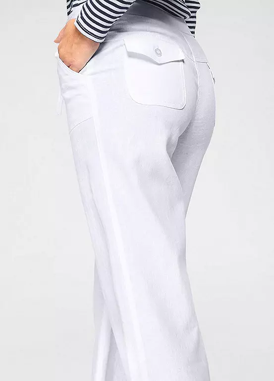 Casual, feminine linen trousers in a straight fit, with waistband with tie-band, large applied front pockets and buttoned rear pockets with flap. Made from a lightweight linen-viscose mix for fabulous comfort.