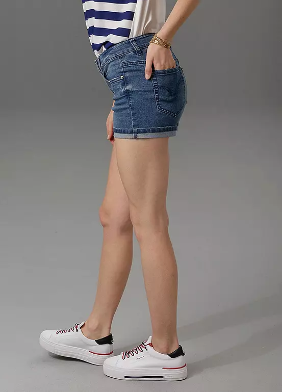 Denim shorts in a slim cut that shapes the silhouette whilst providing plenty of comfort. As well as front and back pockets, there is also a small coin pocket. In a soft cotton blend with a washed effect that is durable and stylish. Team with a feminine top and trainers for a good looking outfit in no time.