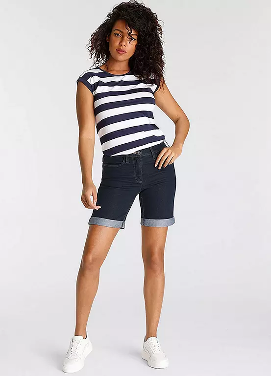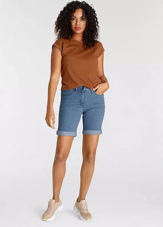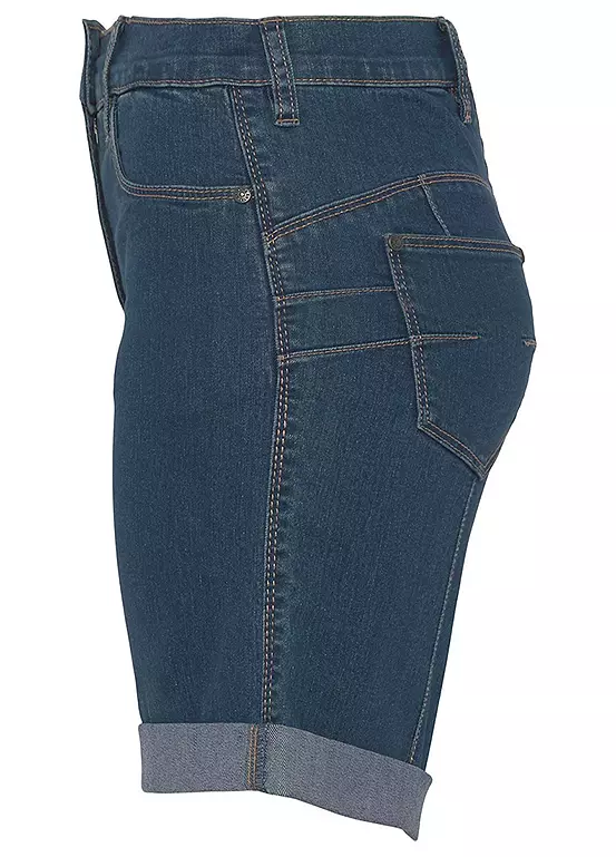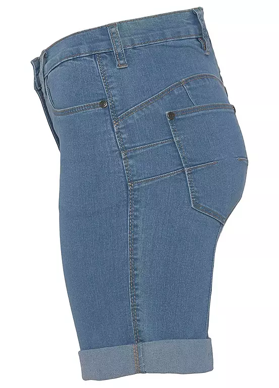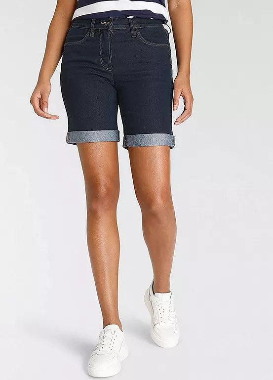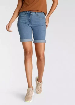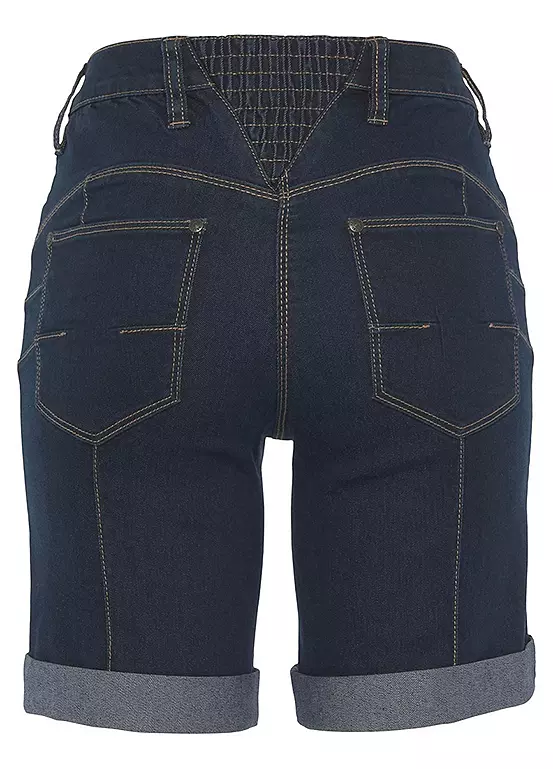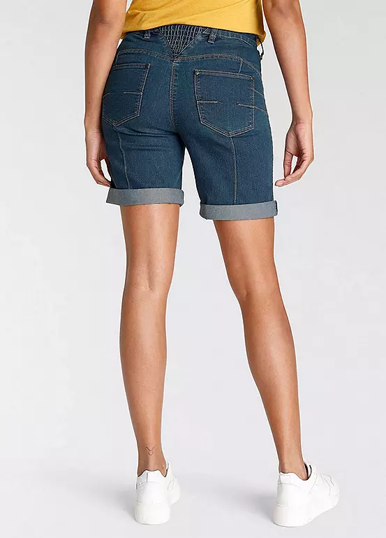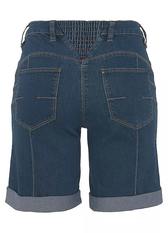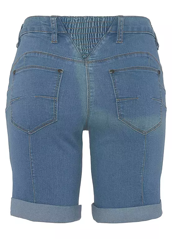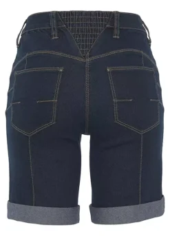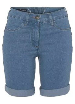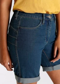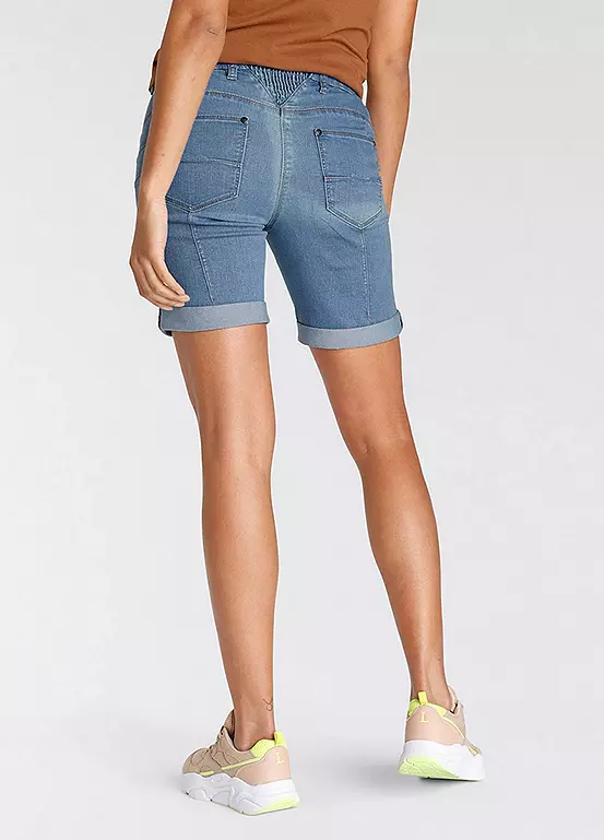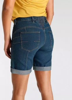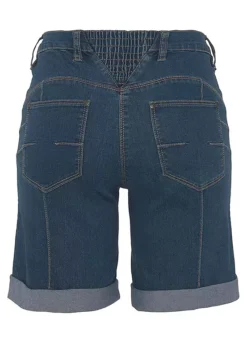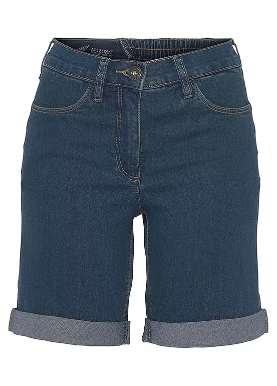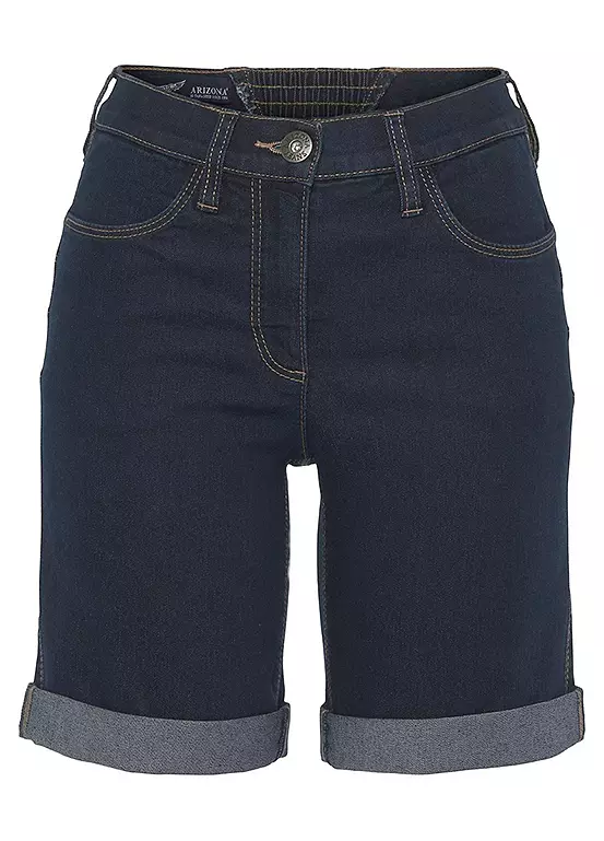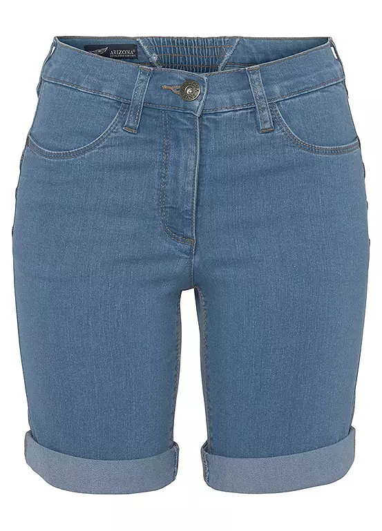 Womenβs denim Bermuda shorts from the Arizona brand. With wide pant legs, high waist, foldable hem with ruffles on the back waistband. The robust and stable denim quality makes the pants durable.