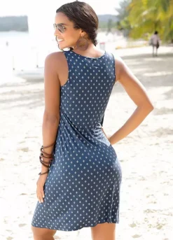 Get a pretty, buoyant look in this lovely blue and white dress with wide straps and flattering pleats at the front. Features a fab all over ornamental print.