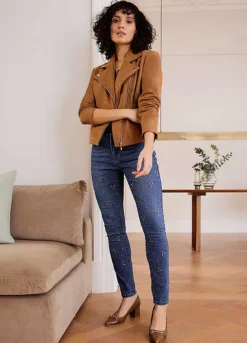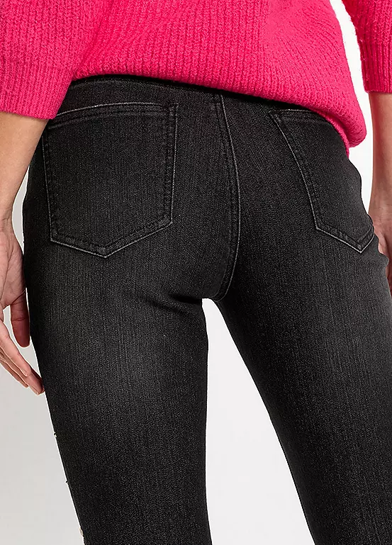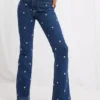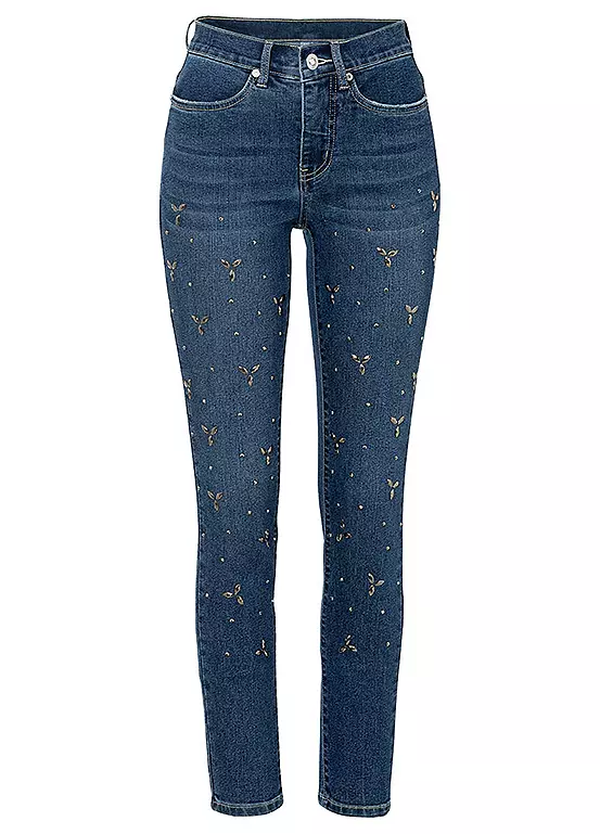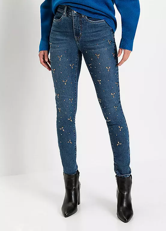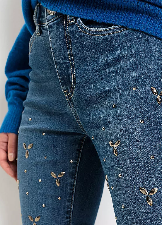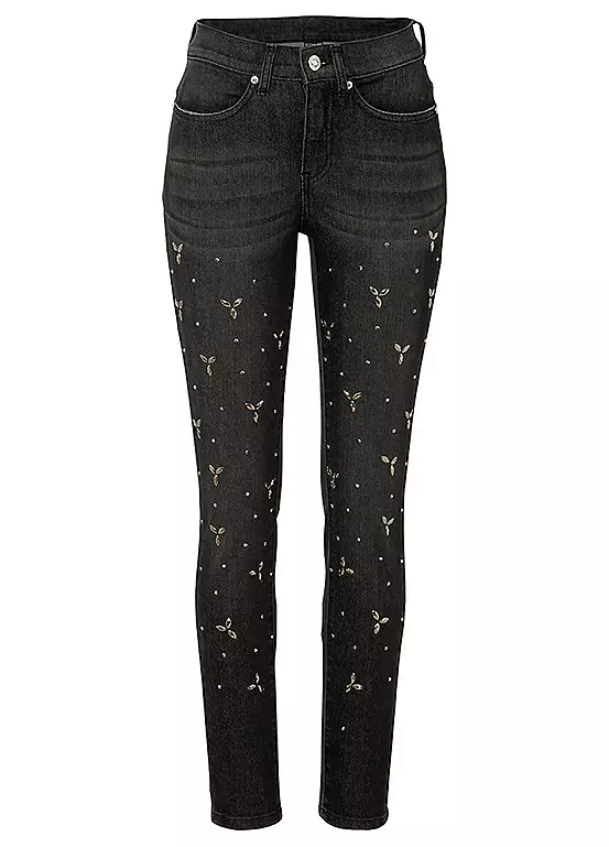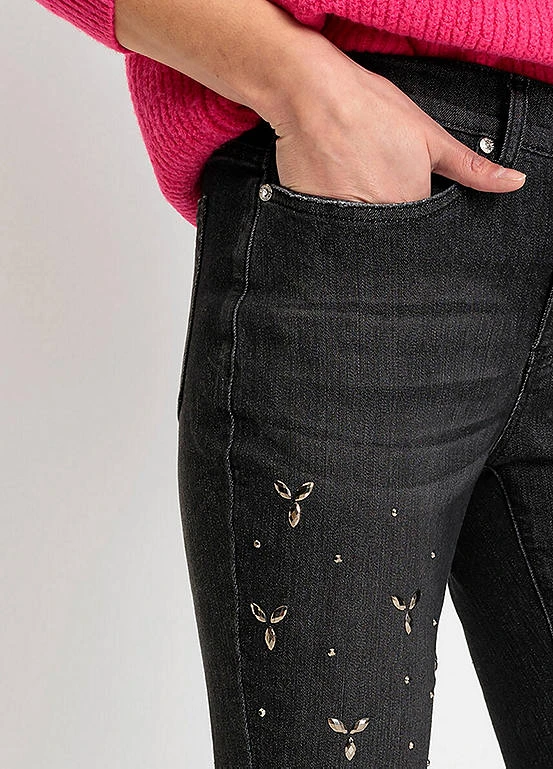 Straight cut jeans with beaded appliqués.