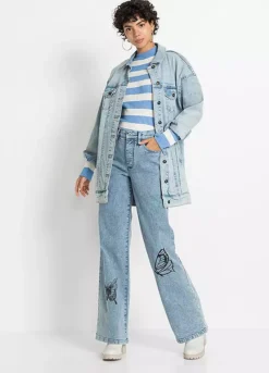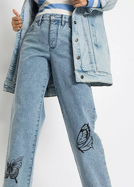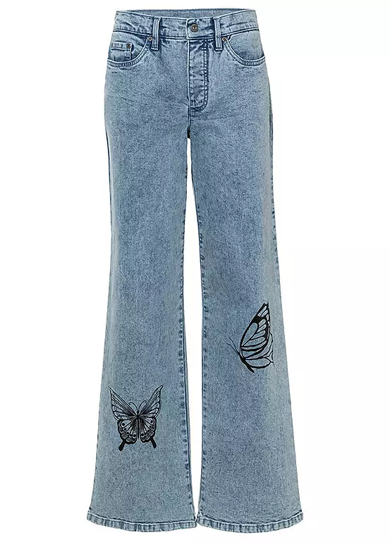 Wide-leg jeans with butterfly prints.
