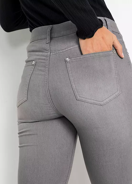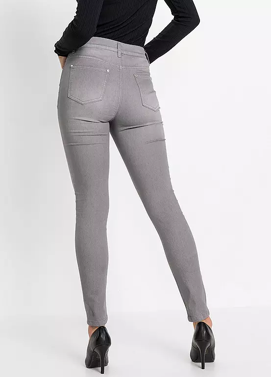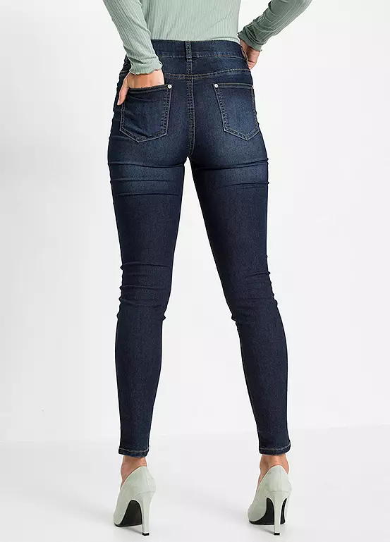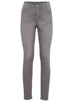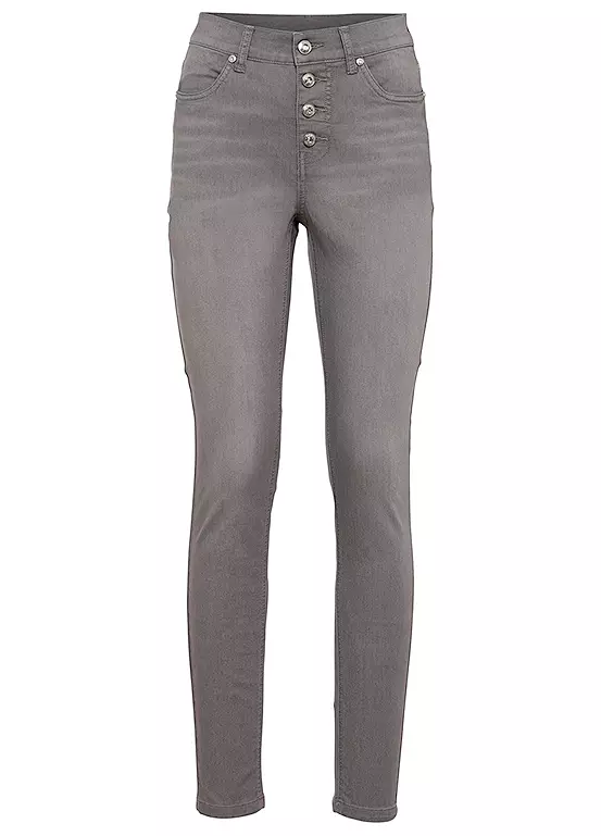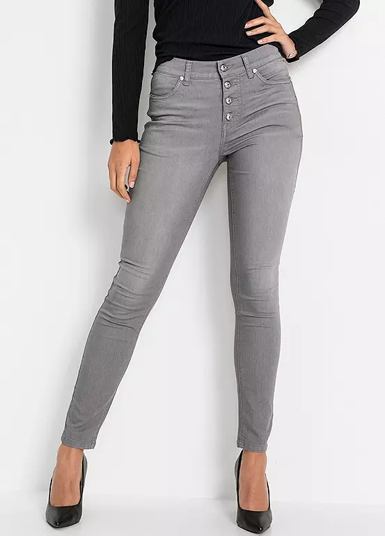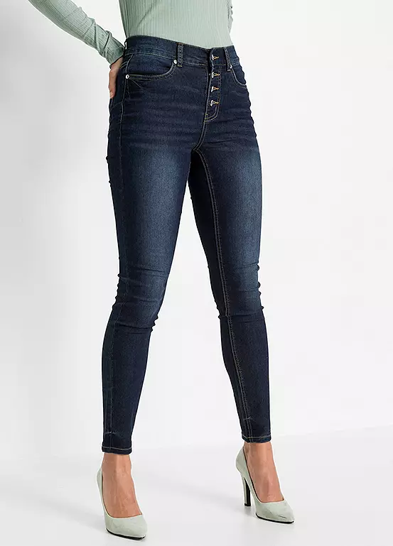 A pair of skinny jeans with a button fly.