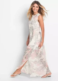 An enchanting maxi dress with a round neckline and in a sleeveless design that features a ornamental all over print on the sheer chiffon shell and has a hidden zip fastening at the back.