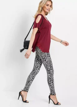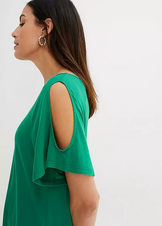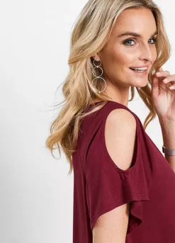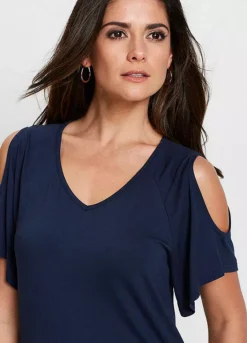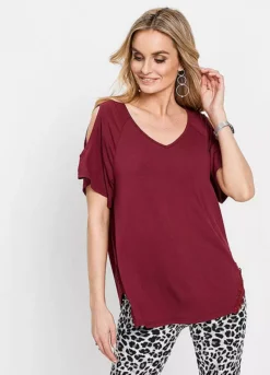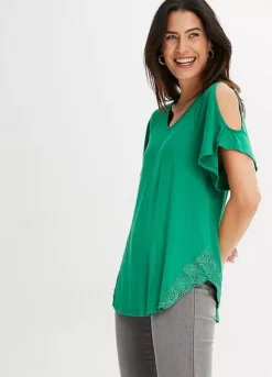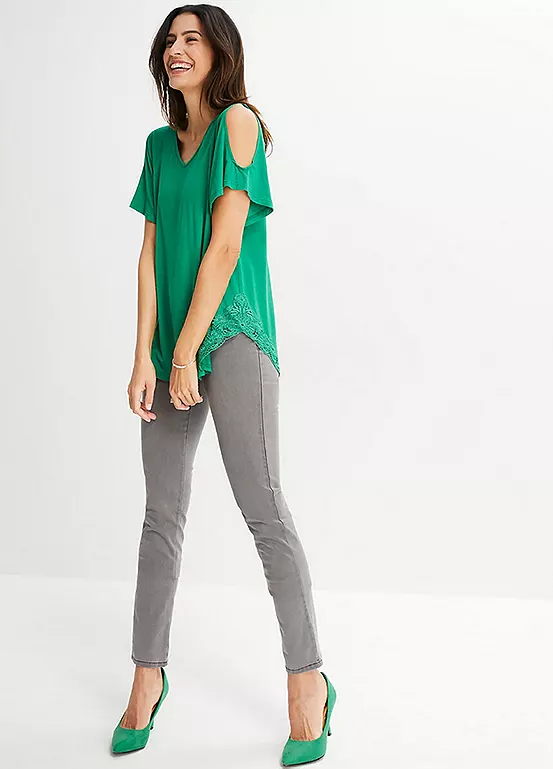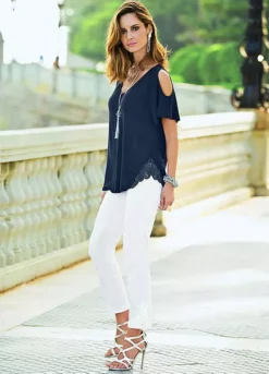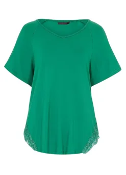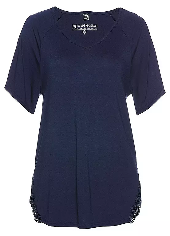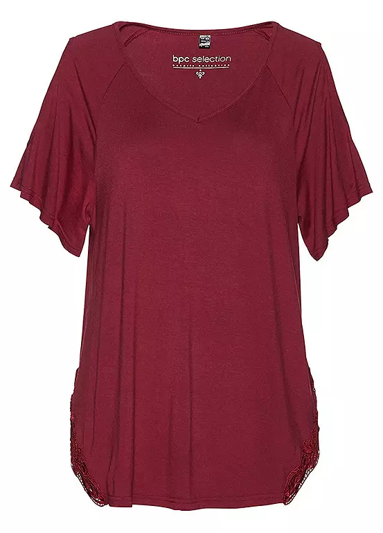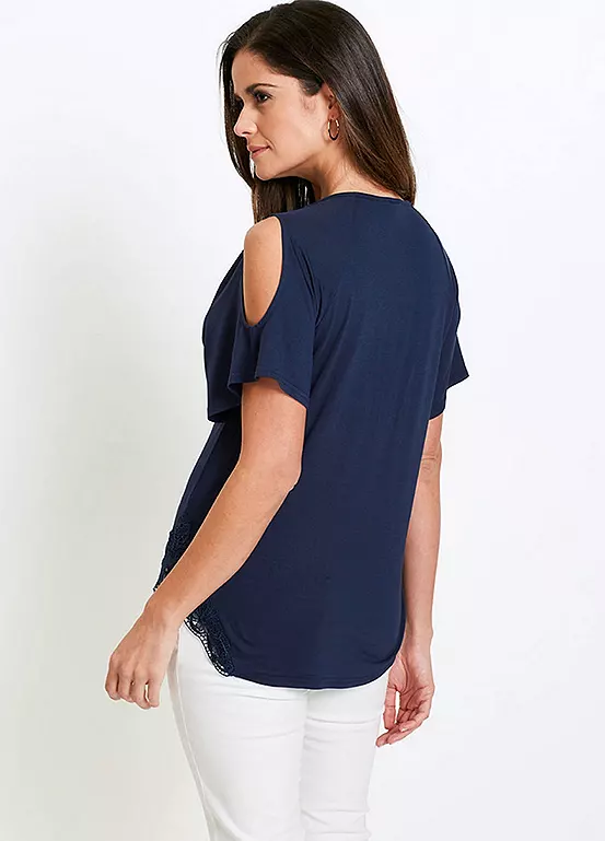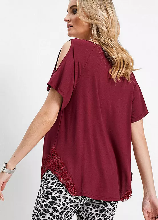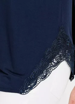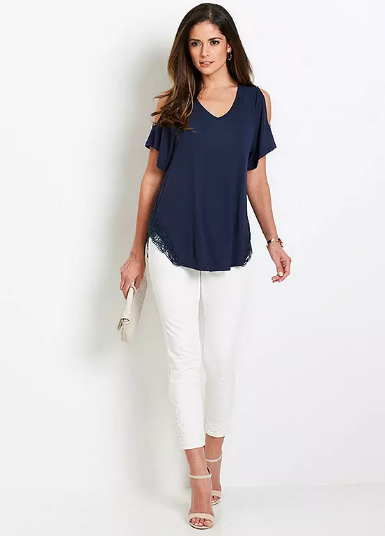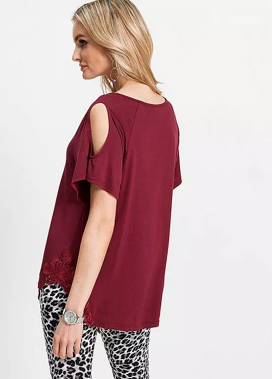 A plain tunic that has that certain something, and offers a beautiful feminine look. Styled with a v-neckline and short sleeves, this jersey tunic has fashionable cut-outs at the shoulder and features pretty lace trim along the hem.