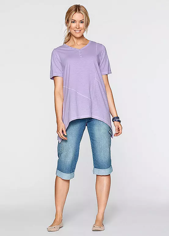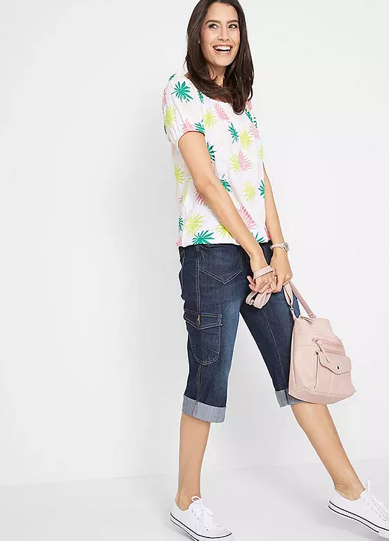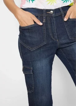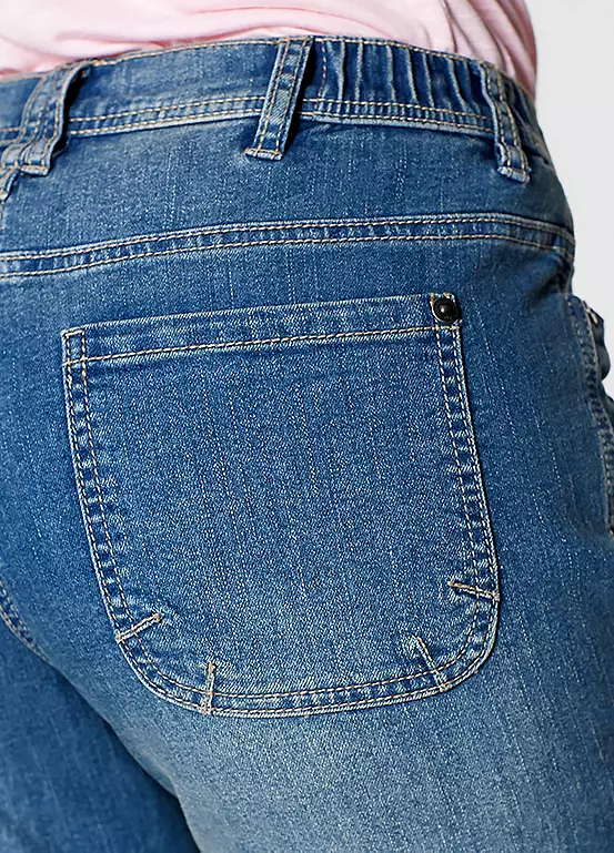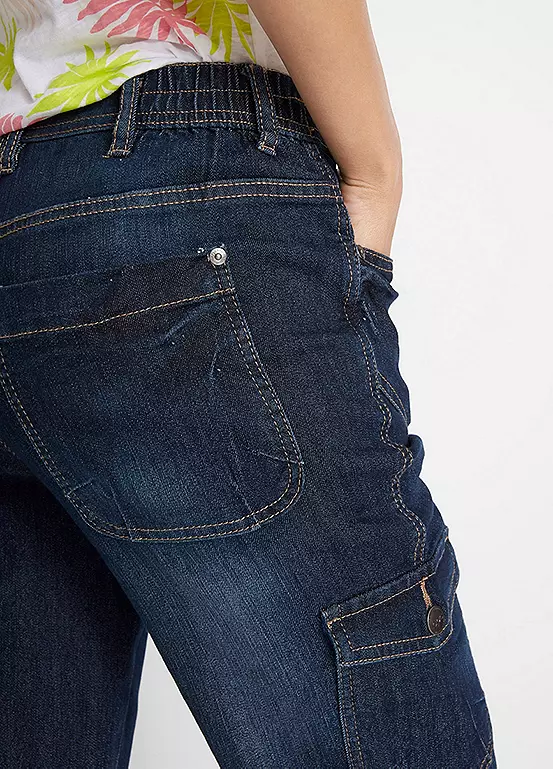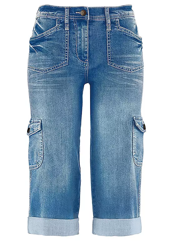 A summery pair of cropped jeans with cargo pockets at the thighs, side pockets and two more cargo pockets at the back.