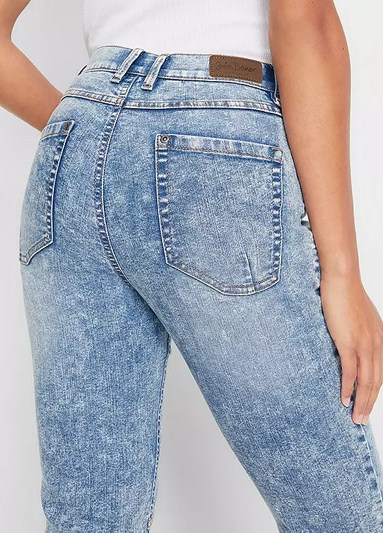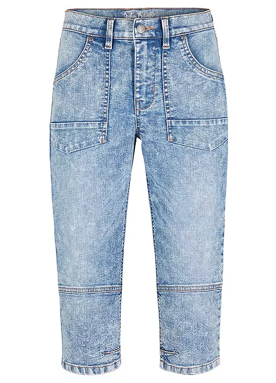 A pair of stretchy denim jeans with large pockets and a cropped leg.
