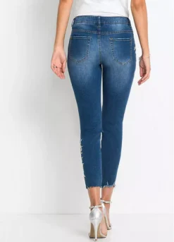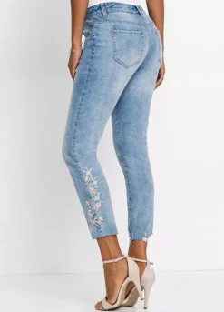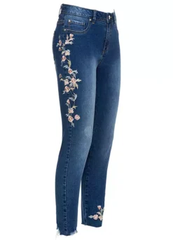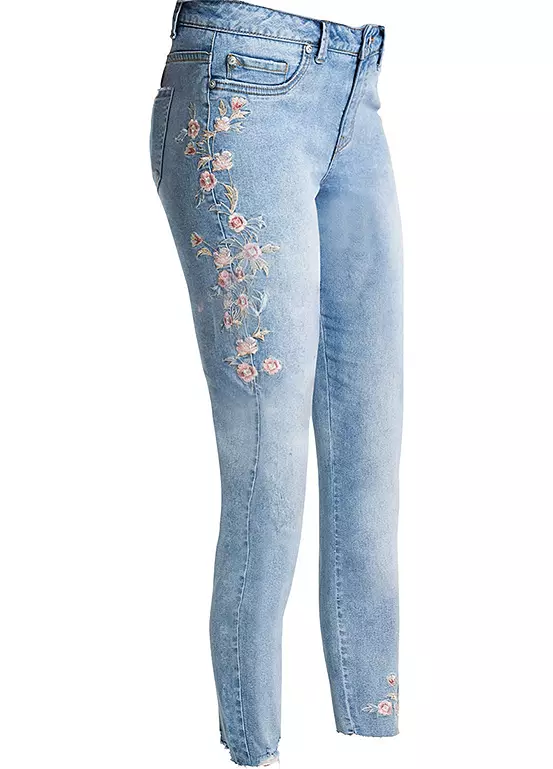A pair of cropped jeans with floral embroidery down the sides and raw ankle hems.