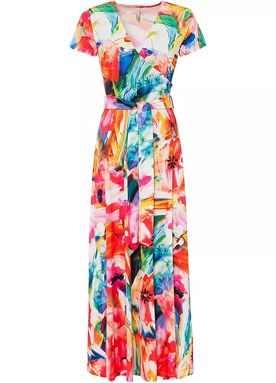 Brightly printed maxi dress with waist ties, a flattering neckline and short sleeves.