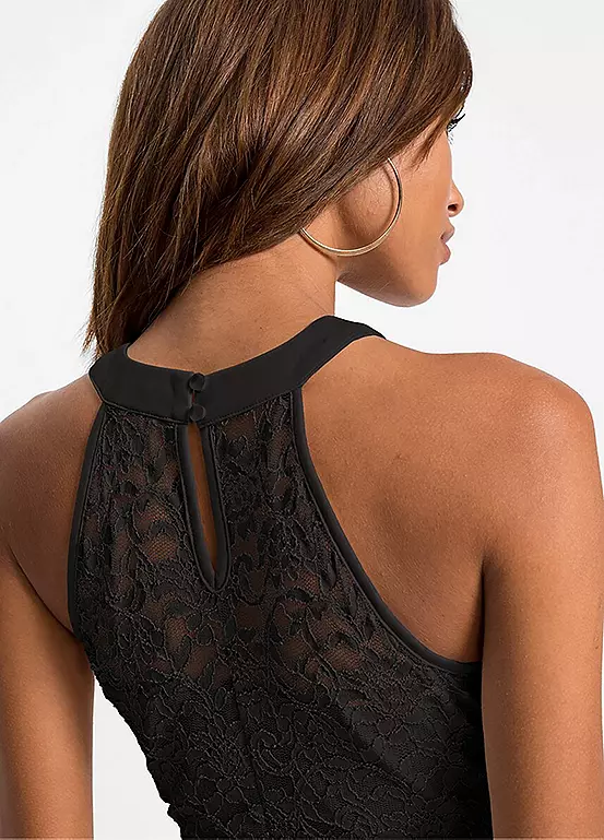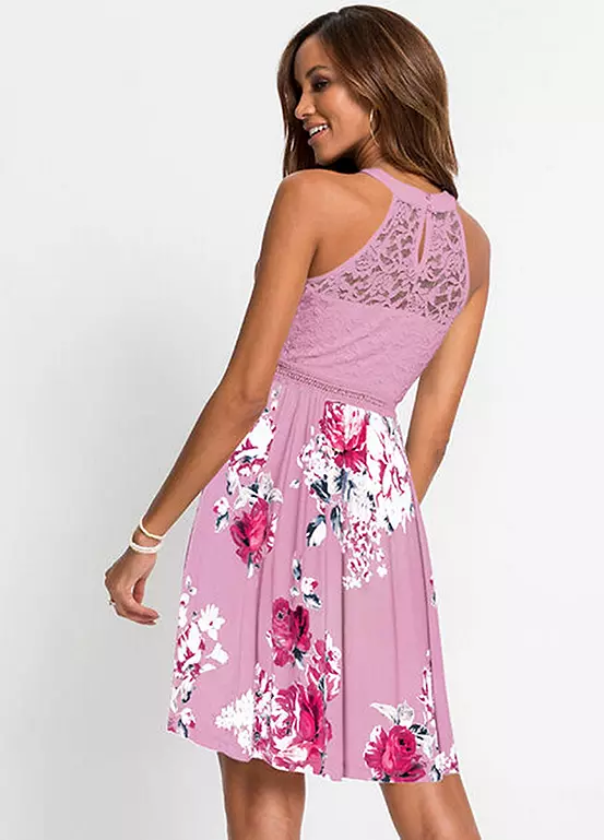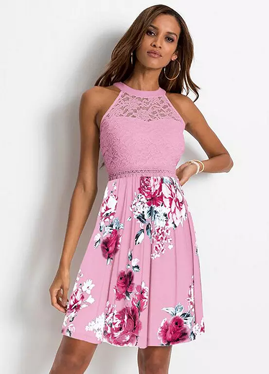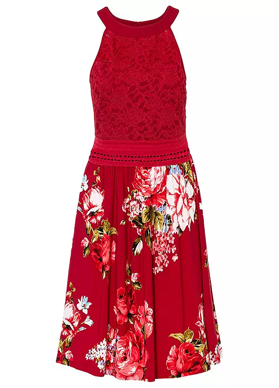 This romantic dress comes with a lace covered bodice and a floral print skater skirt.