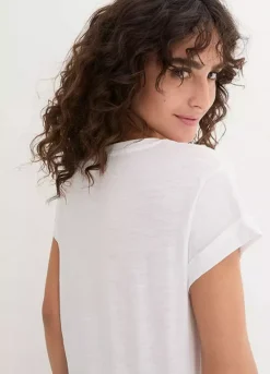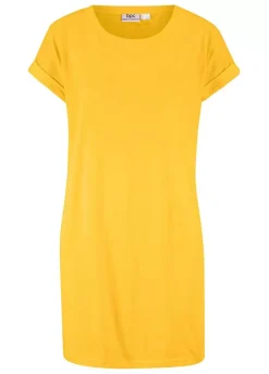 Attractive extra long jersey tunic with turn-up cap sleeves.