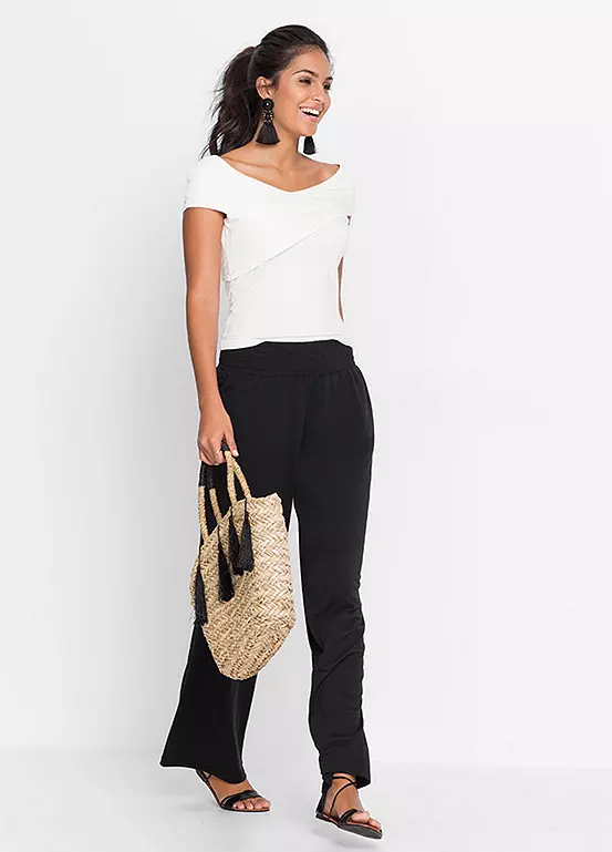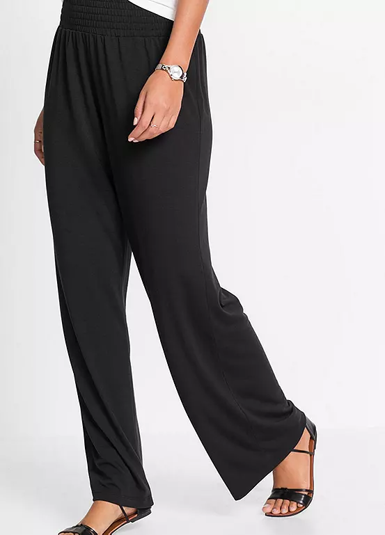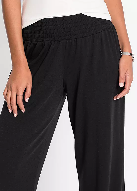 These palazzo trousers offer feminine charisma and are in a wide leg design and feature a comfy elasticated waist and a great companion for the summer.