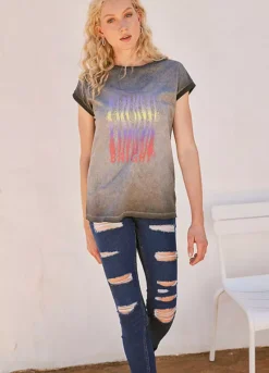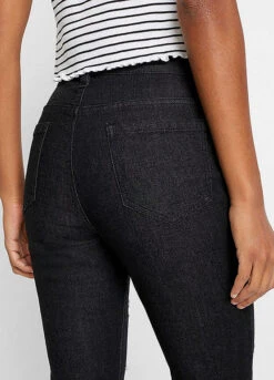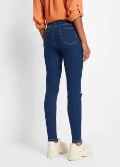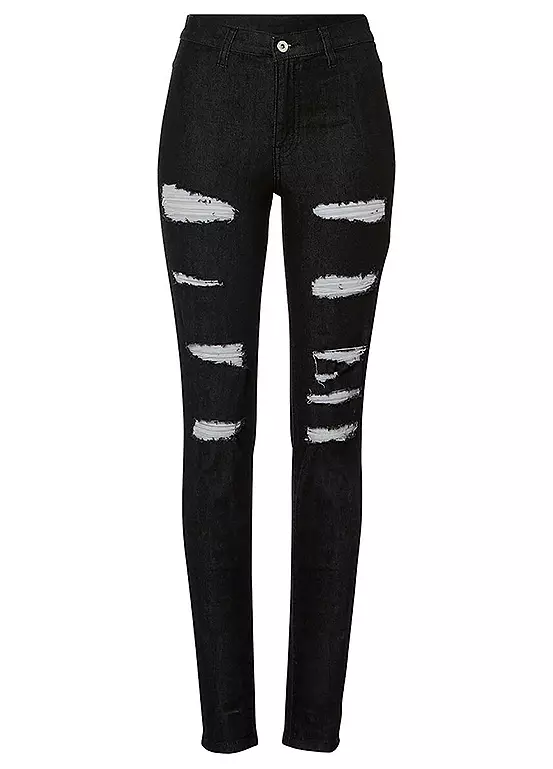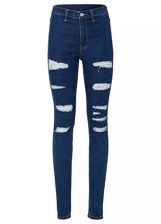 Stretchy denim skinny jeans with rips down the front of both legs.