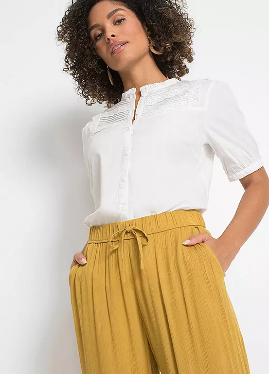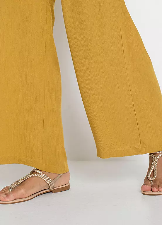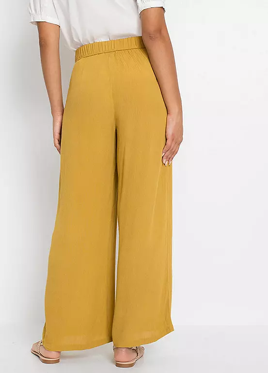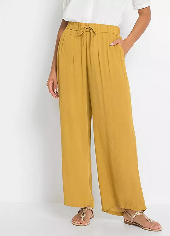 Pull on trousers with a wide leg.
