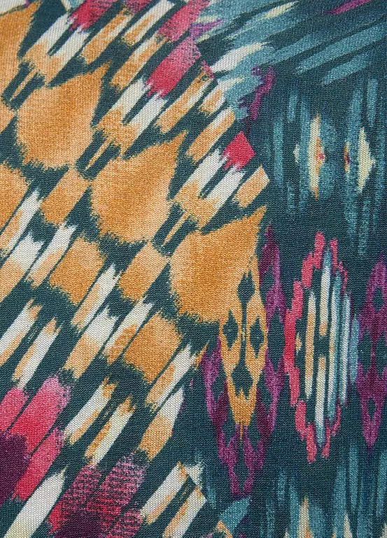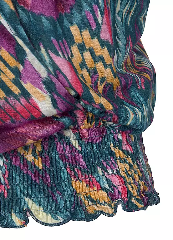 A charming top in an all-over print, each piece is unique. Finished with short sleeves, a gathered hem and an overlapping wrap-around front with a snap button. Figure-hugging fit.
