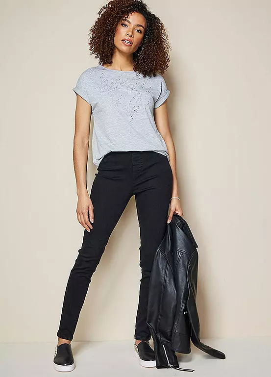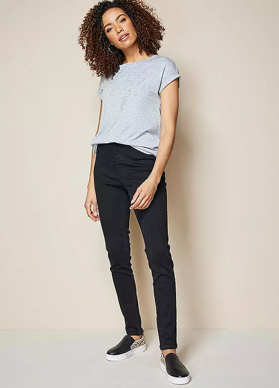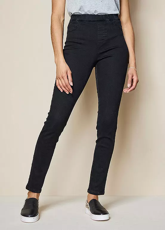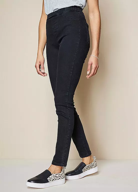Our new must have denim jeggings! A βgo toβ wardrobe staple, our comfort fit jeggings will go with almost everything all year round! Featuring an elasticated waistband and mock front pockets. Two pockets to the back.