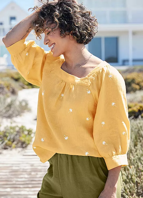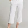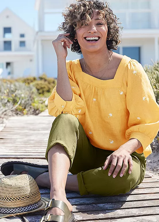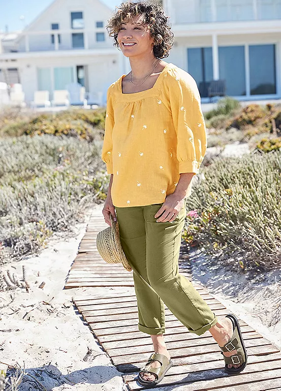 Our breezy Frankie navy linen trousers with handy pockets and a comfy elasticated waist.