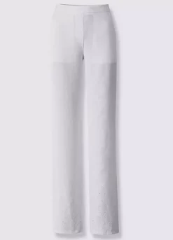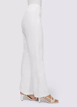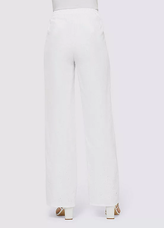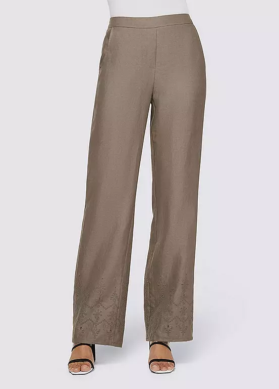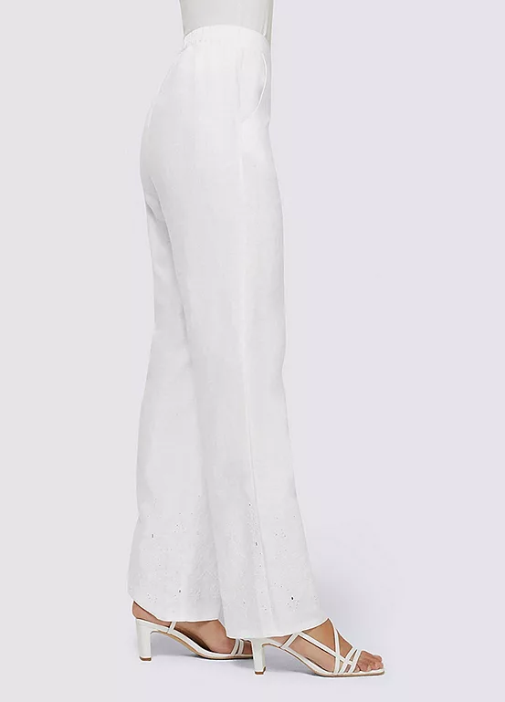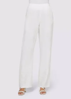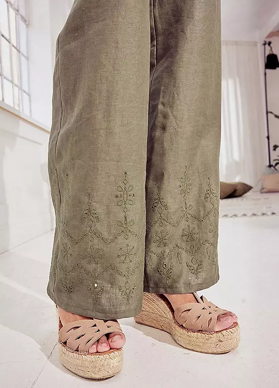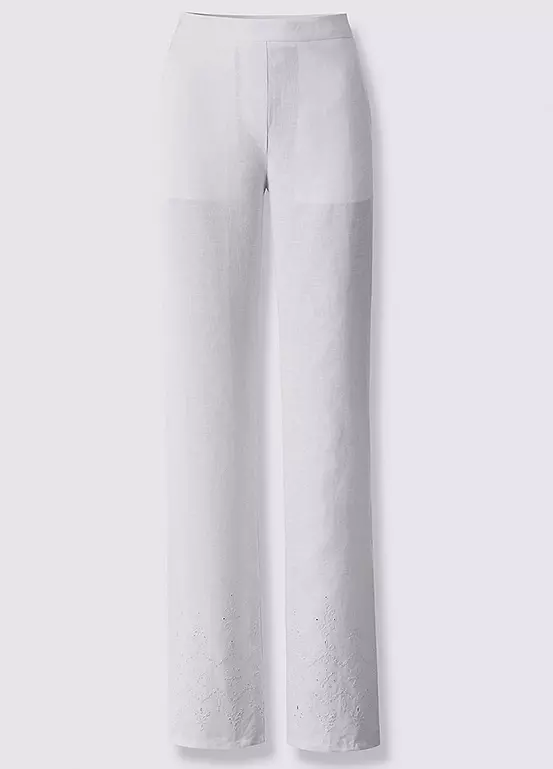 Linen slip-on trousers with fashionable cut-outs in a floral design and artistic embroidery. They come in a comfortable wide leg style with modern faux piped back pockets.