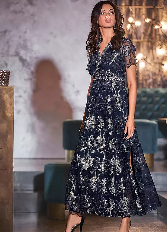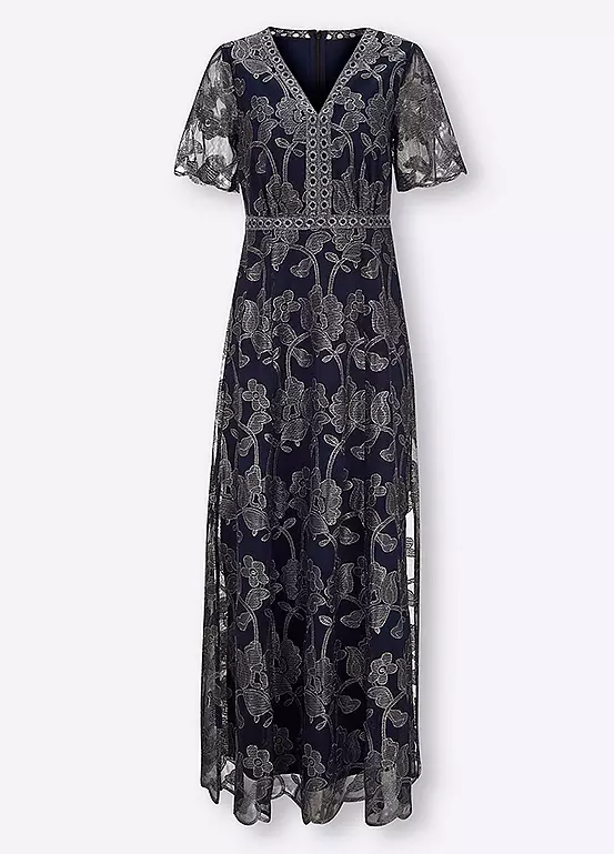 This evening dress is a real gem made from light mesh fabric with generous floral embroidery and border. Featuring transparent short sleeves with curved hem, a fine-stitched zip at the back and side vents.