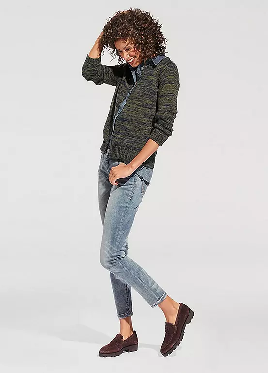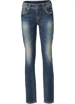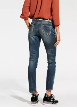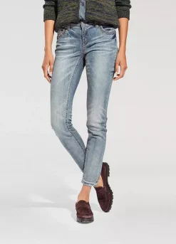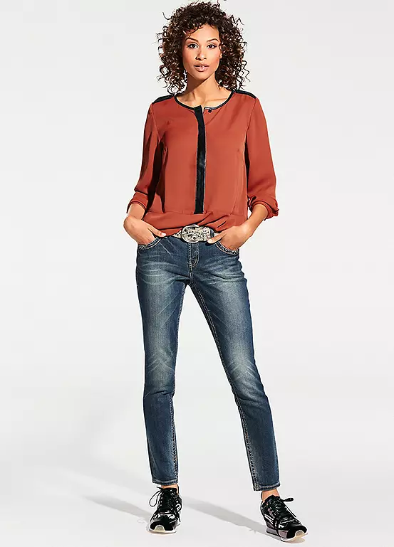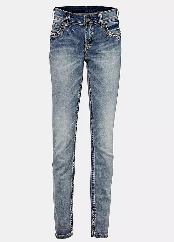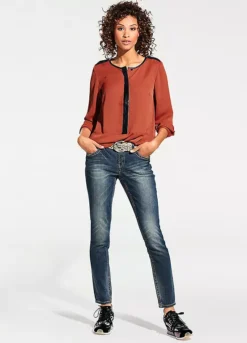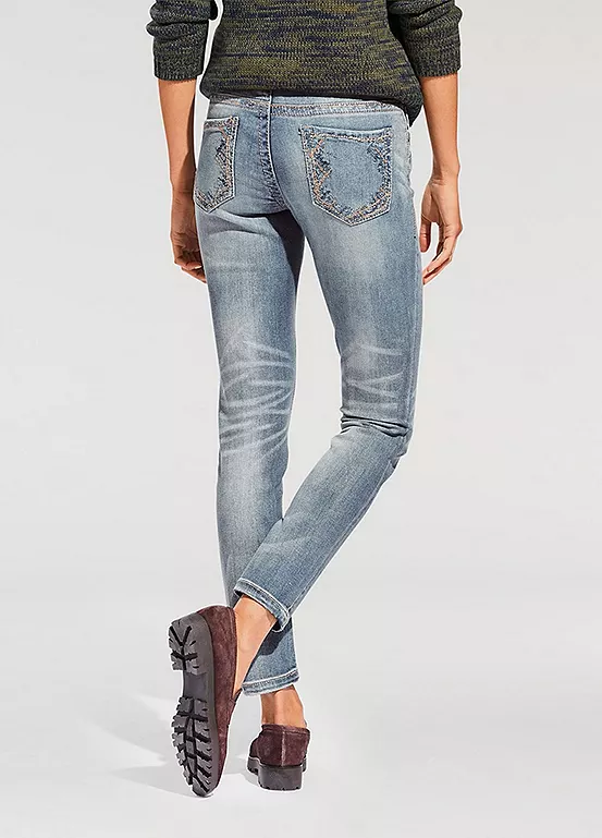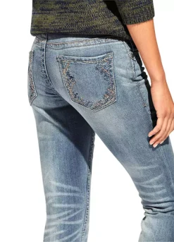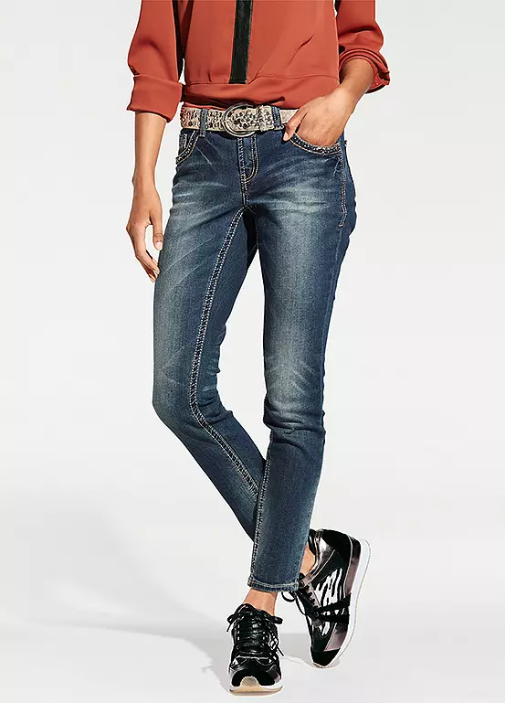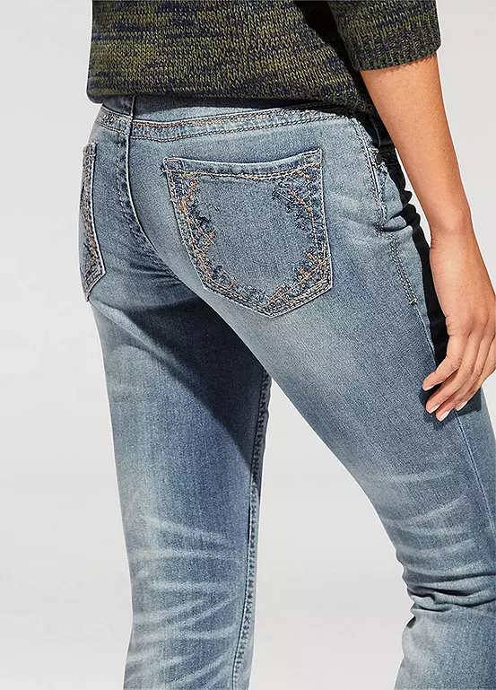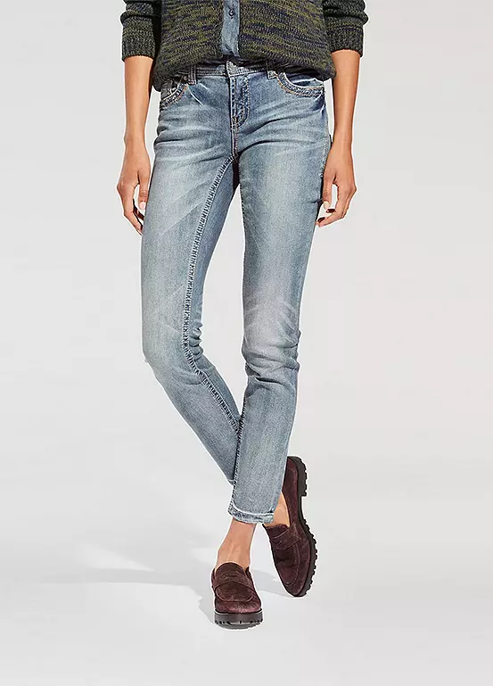 Shapewear jeans, in trendy used look with attractive embroidery. In a flattering slim fit, with integrated power mesh for a beautifully flat stomach. Styled with a slightly lower waist, in a slim fit design, finished off with a zip and button fastening.