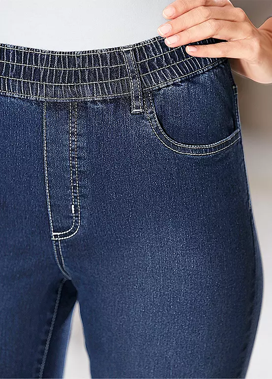 The extra-high fully elasticated waistband is the highlight on these jeans. It not only looks super trendy, but also makes your tummy appear flatter! With belt loops, a mock zip, two front pockets and two back pockets.
