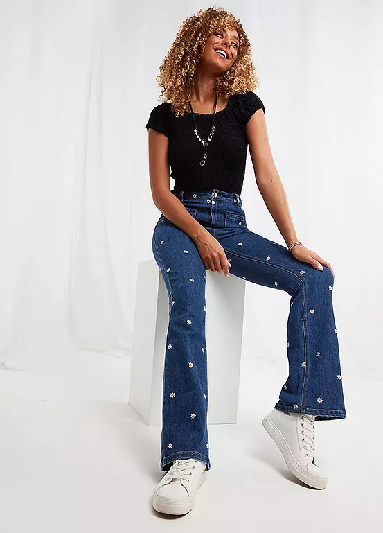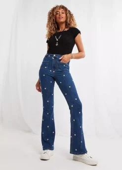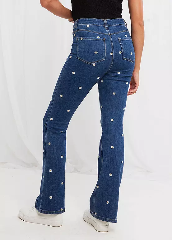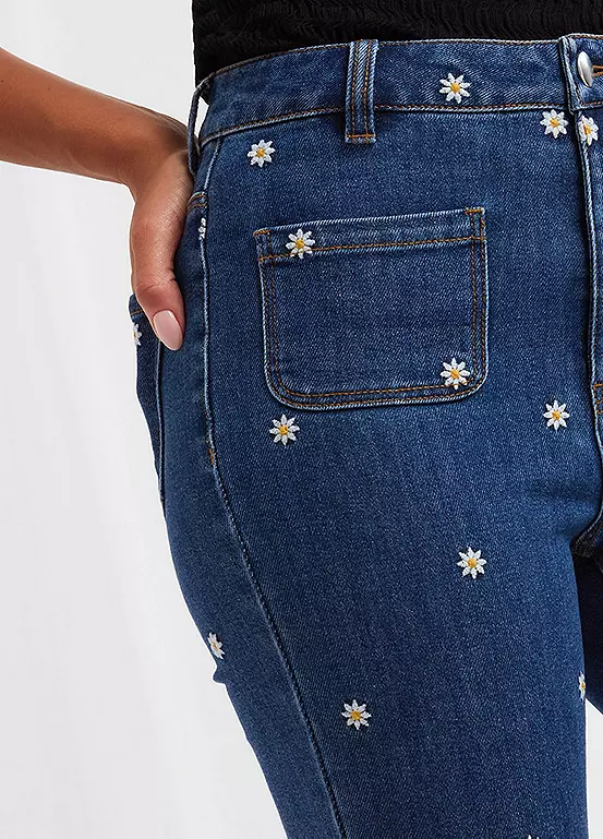 A cute twist on classic denim, it’s all in the detail with these stunning bootcut jeans. Popping with pretty daisy embroidery and finished with remarkable front pockets, we’ve created a truly unique style here. We even crafted its mid-wash denim from recycled polyester, so they not only look good, but they do good for the planet too.