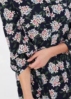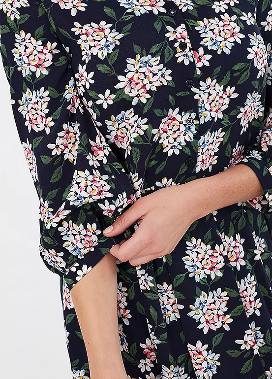 A woven printed midi dress featuring a button placket, pleat detail at the waist, forward shoulder seam and back neckline tape.