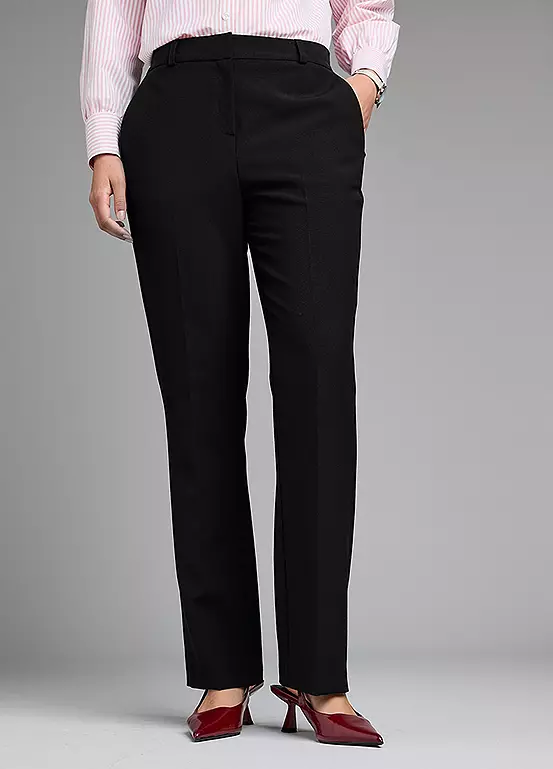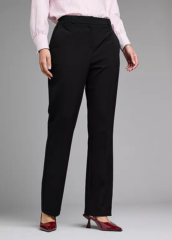 We have improved the fit and fabric of our best selling straight leg trouser to make these even better! With side back elastic for discreet added comfort all day long our straight leg trouser is a must have for all year round! This flattering style will ensure you look elegant on any occasion. Perfect to wear to the office or dress down for a more casual weekend look. Featuring a flat waistband to the front and elastic at the side for added comfort and no gaping. Front fly fastening and two handy side pockets. Pressed creased to the front and back.
