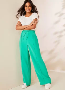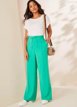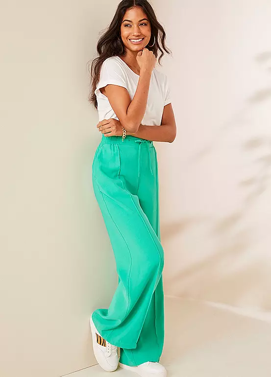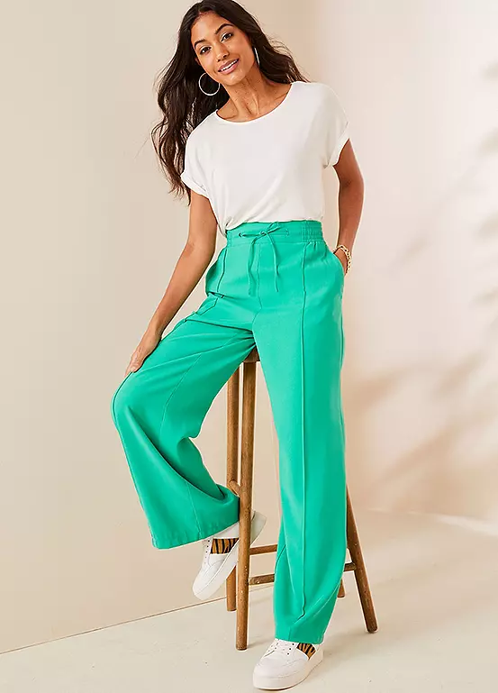 Our new shape wide leg trousers are designed with full-length legs and a flattering high-rise waist. Drawstring ties and an elasticated waistband for comfort. Two practical side pockets, plus mock pockets at the back for a polished look.