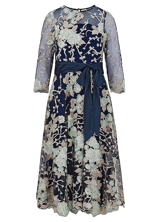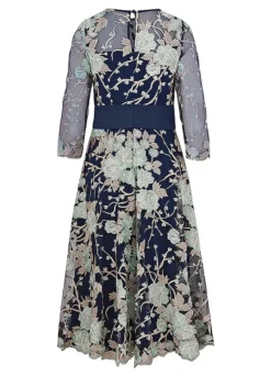 This gorgeous navy and mint embroidered prom dress gives you the perfect occasion look. Itβs a fit and flare style with a scoop neckline and a three-quarter sleeves and satin belt detail to the waist.