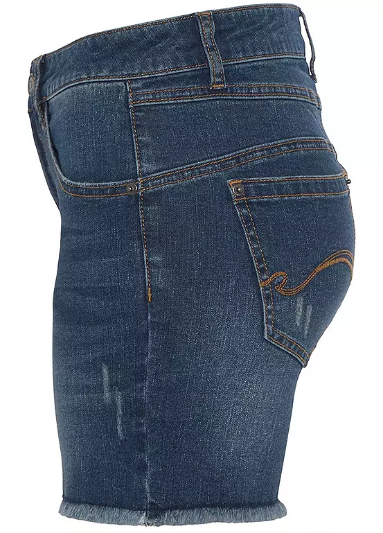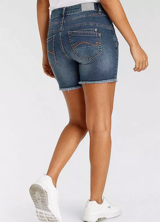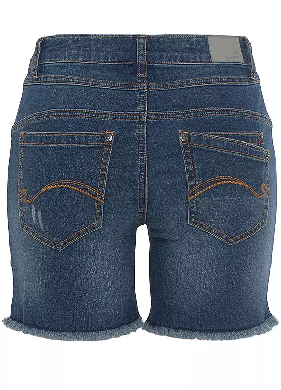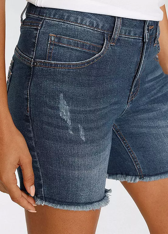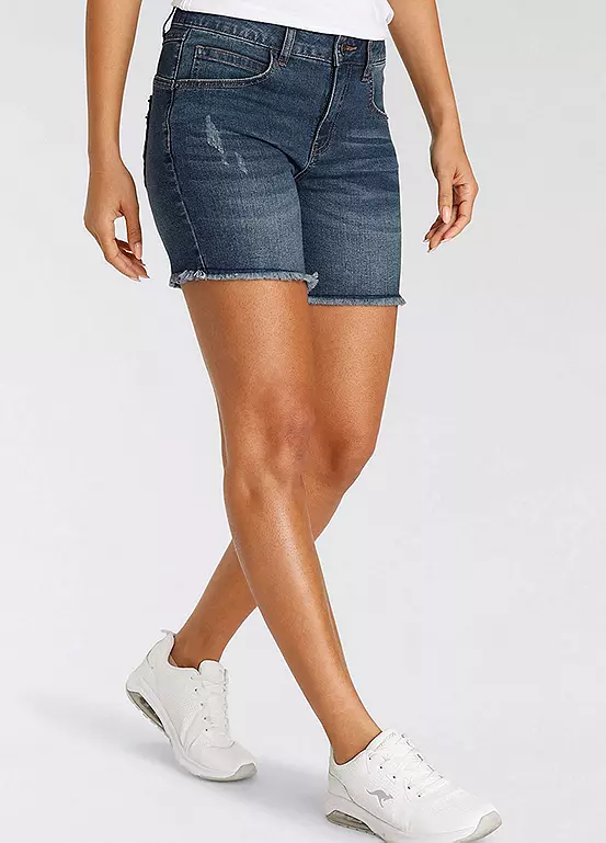 Casual denim shorts with a fashionable fringe hem and a distressed look. In a five pocket style with a regular rise and comfortable stretch denim fabric.