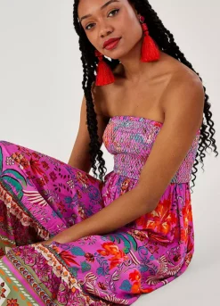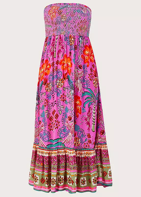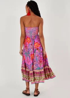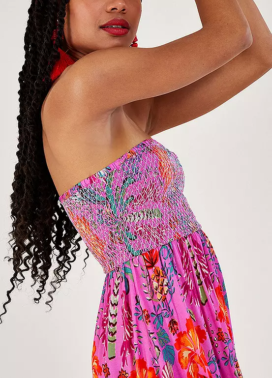 Something easy to slip on for evenings by the beach and dinners on the marina, this palm print dress features a shirred, sleeveless bodice that falls into a relaxed midi skirt.