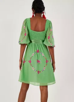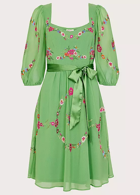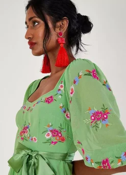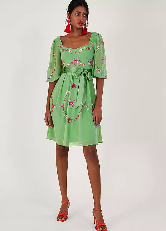Boasting embroidered florals that bloom on a refreshing apple green backdrop, this dress is ideal for summertime partying. The sweetheart neckline and billowy sleeves add a feminine finish, all tied up with a sleek satin bow to the waist.
