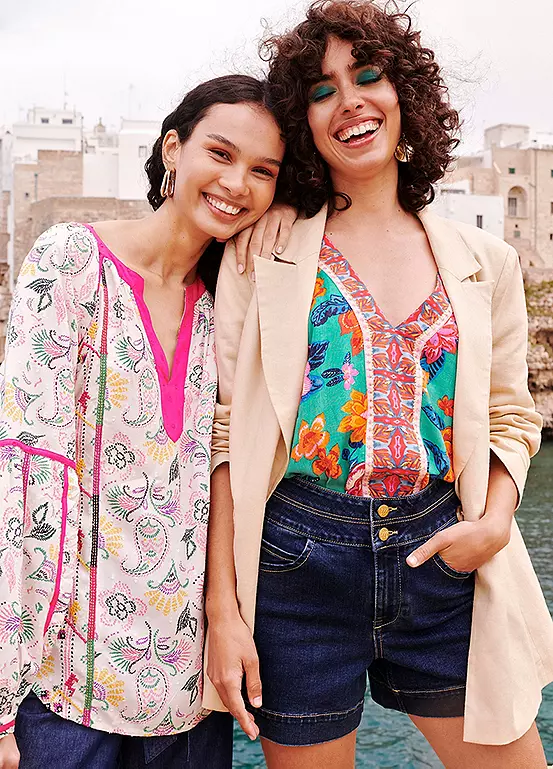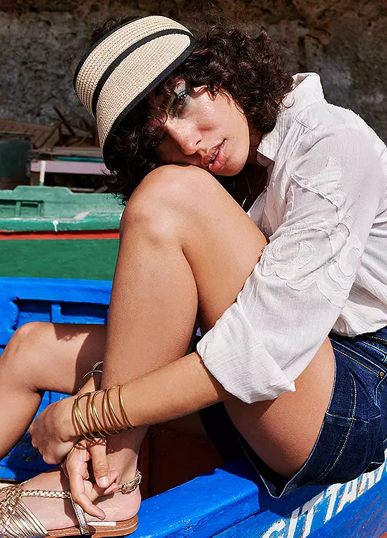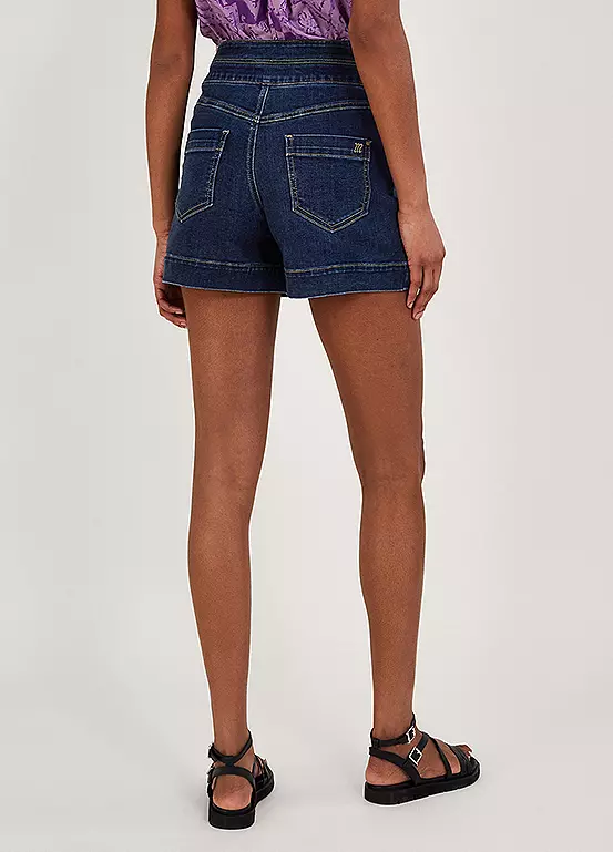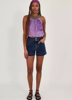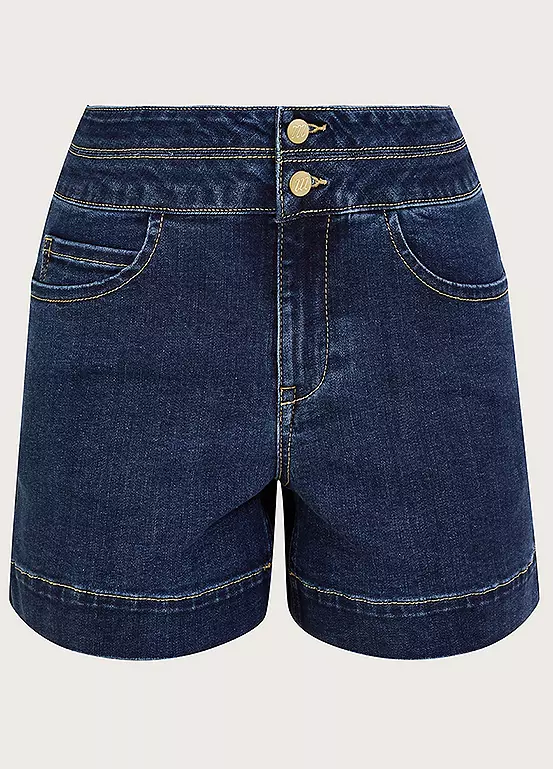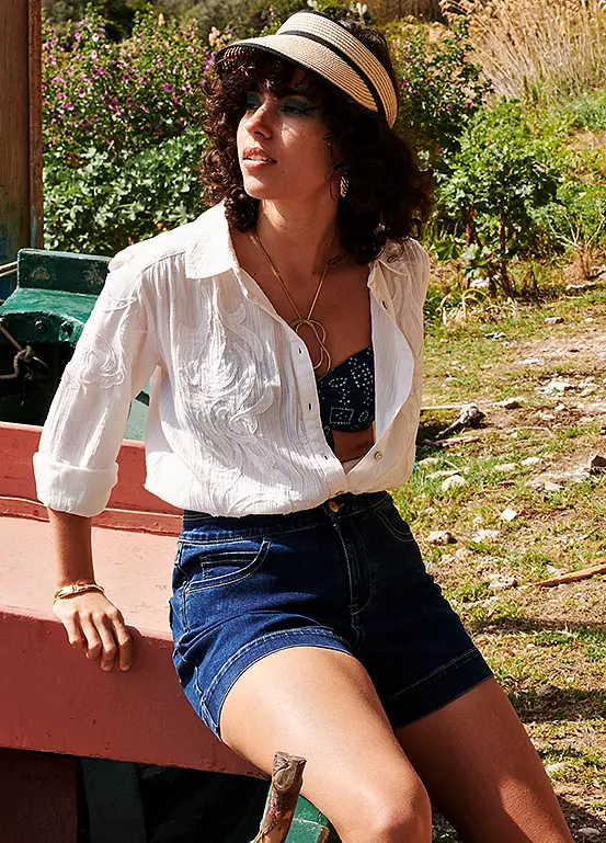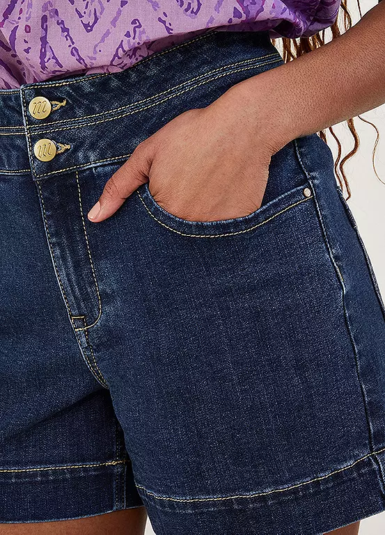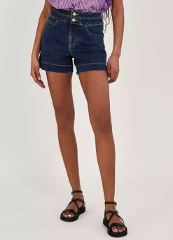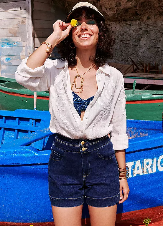 Summer just isnโt the same without a pair of denim shorts on hand. This pair is designed with a high-waisted silhouette and a secure double-button fastening to finish. Style them with a simple cami, or opt for a more smart-casโ look with a light and airy blouse.