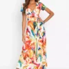 This dress has the ’Wow’ factor for sure. You won’t be disappointed with this gorgeous occasion wear dress. Designed as one shoulder knee length dress with chiffon cape overlay and staple gold trim detail.