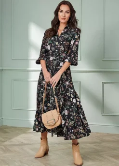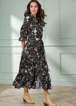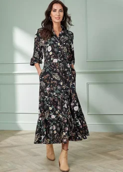 Our stunning shirt dress is a ’must have’ piece for the season. In a floral print it has three quarter length sleeves and self fabric tie detail to the waist and side pockets.