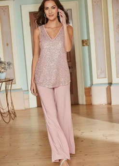 This gorgeous 3 piece set consists of a beautiful sleeveless sequin top, a luxurious waterfall jersey jacket and matching gorgeous jersey palazzo trousers with fully elasticated waistband for comfort.