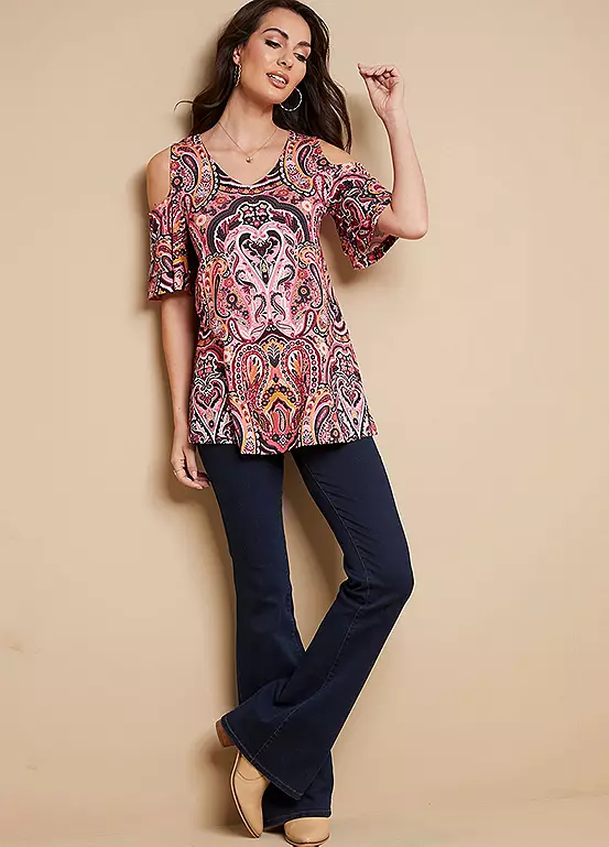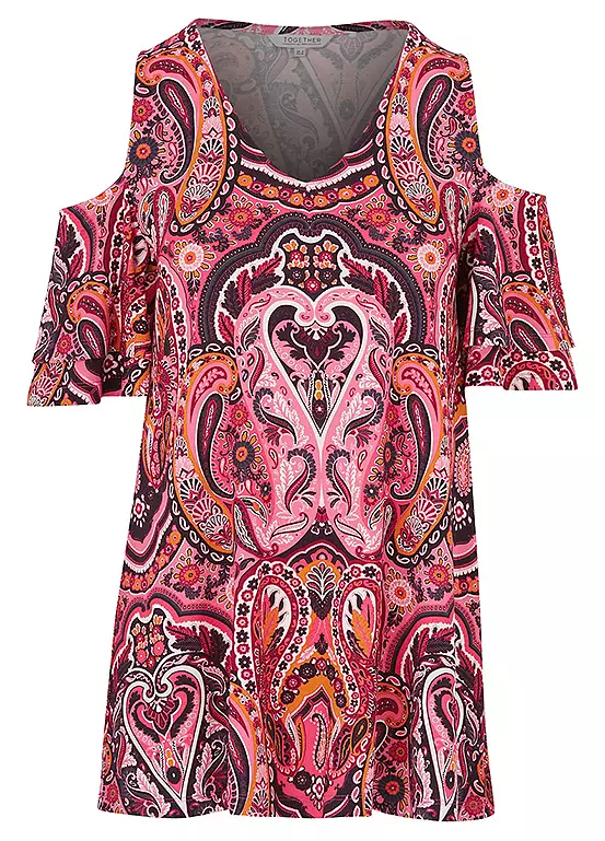 Winter update on our bestselling jersey cold shoulder half sleeve top. Designed in a lovely warm pink tone all over paisley print.