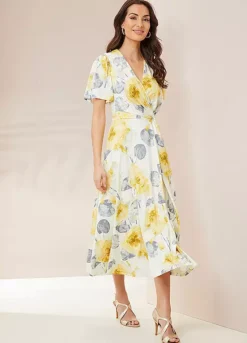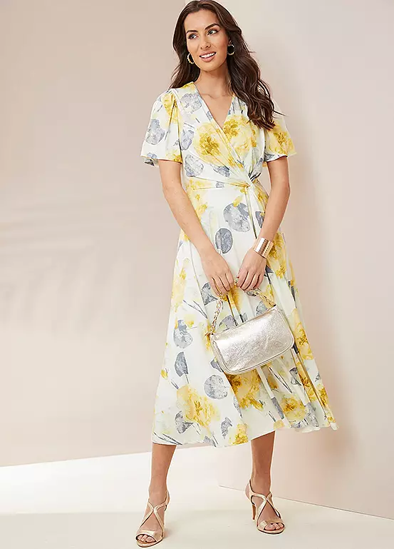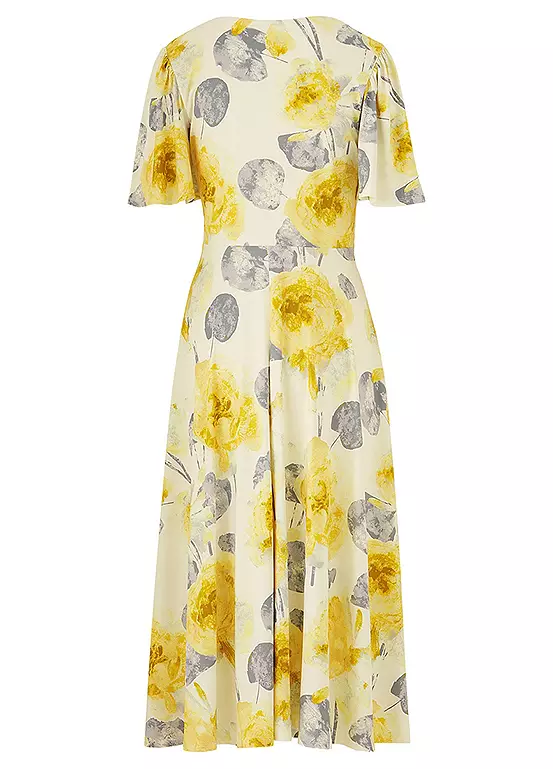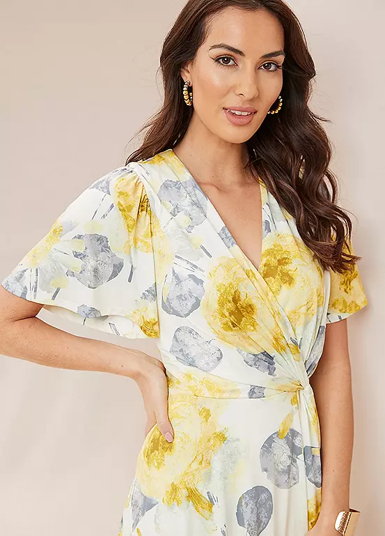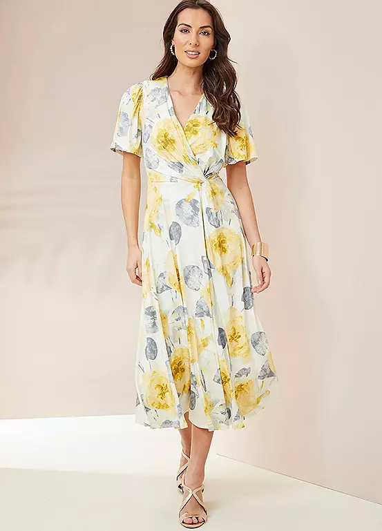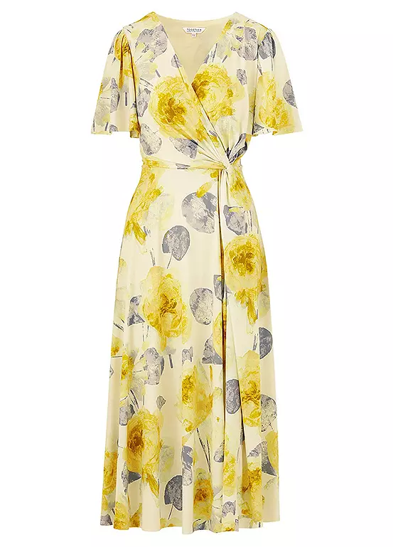 This gorgeous print dress is in a fluid luxurious jersey fabric. Wonderfully comfortable and flattering this dress comes fully lined. The floral print is inspired by botanical gardens and features a wrap detail bodice and a waterfall skirt. With short sleeves, it is a perfect dress for your special occasion, from smart parties to weddings.