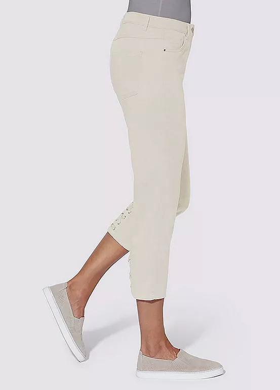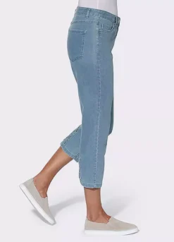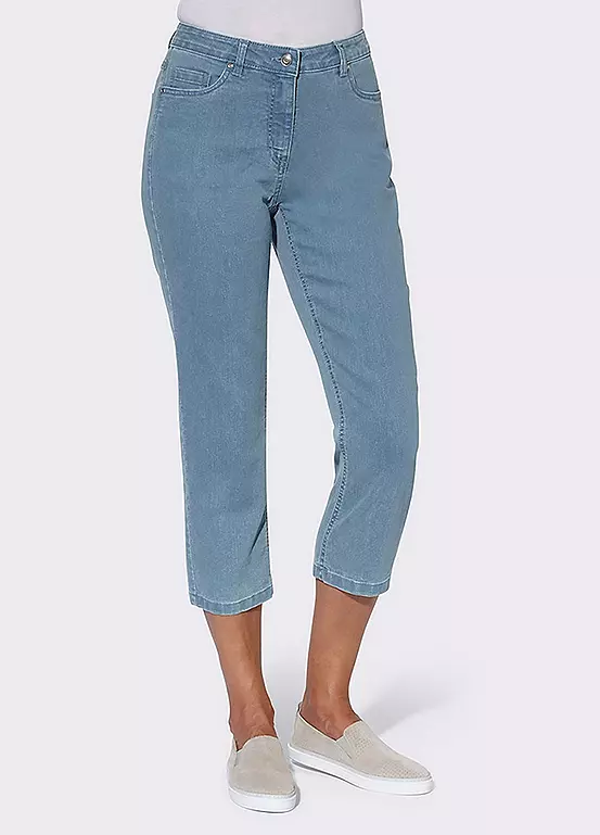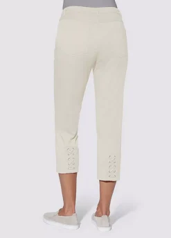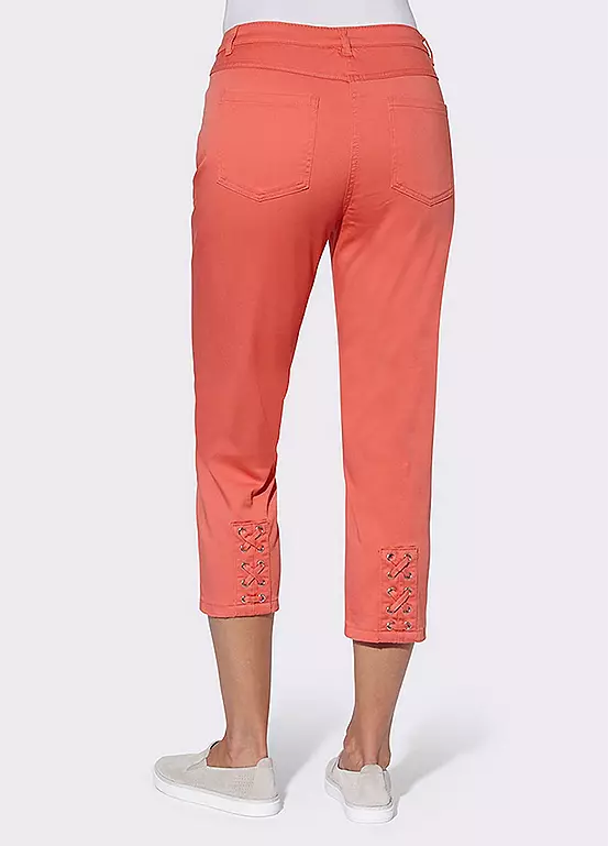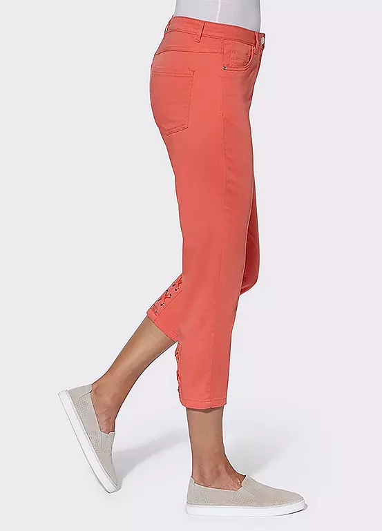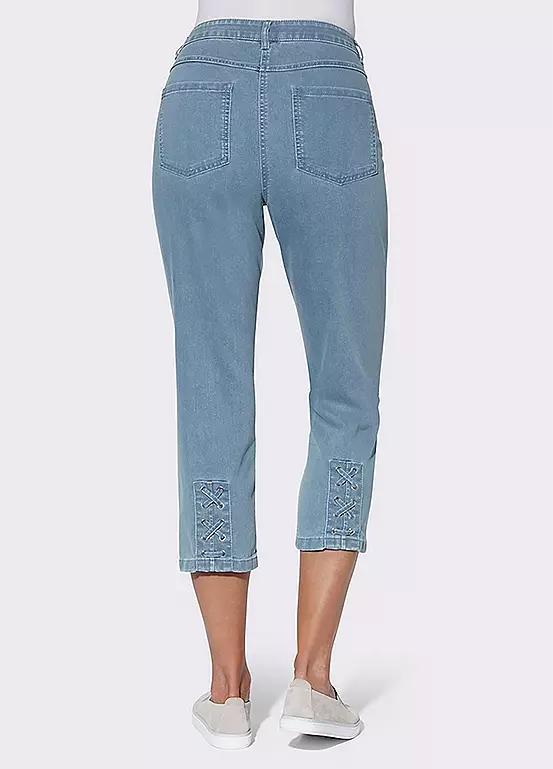 Summery cropped length jeans with eyelets and decorative trim at the back of the leg hems. Shaped waistband, belt loops and button/zip fastening. Popular 5-pocket design with studs on the front pockets. Stretch fabric ensures a great fit.