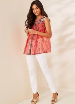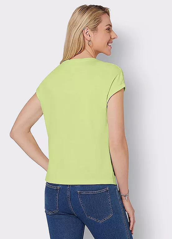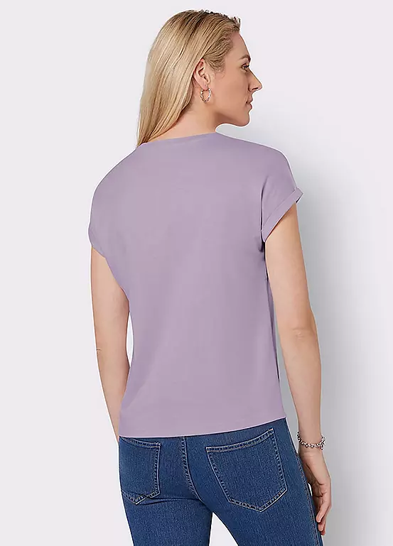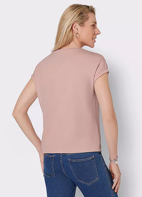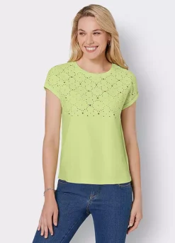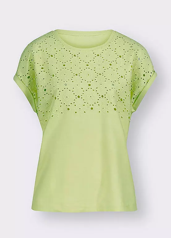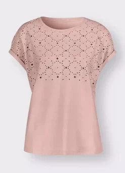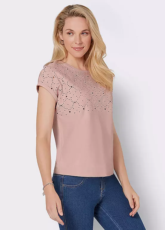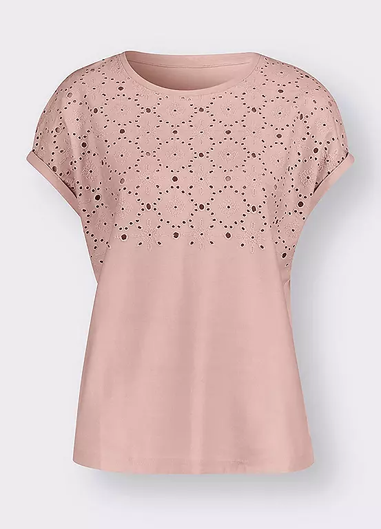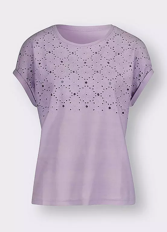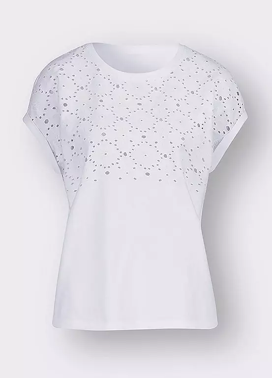 This jersey top has intricate eyelet embroidery on the front thatâs sure to catch the eye. In a trendy silhouette, it features a rounded neckline, dropped shoulders and stylish short sleeves with a fixed turn-up.